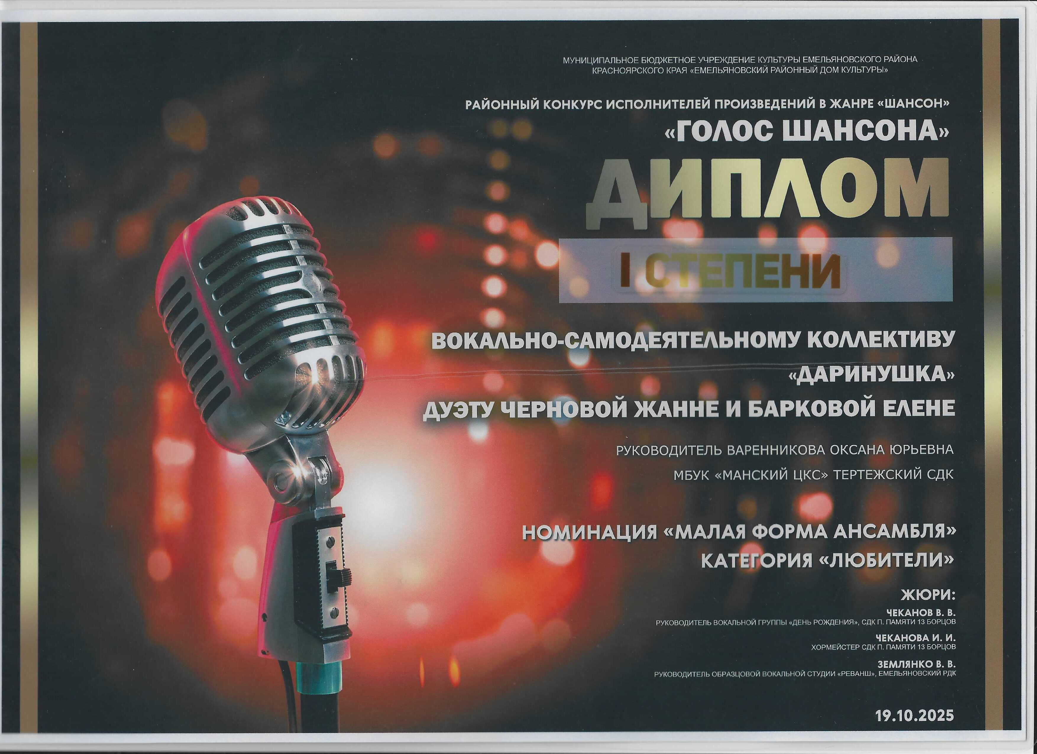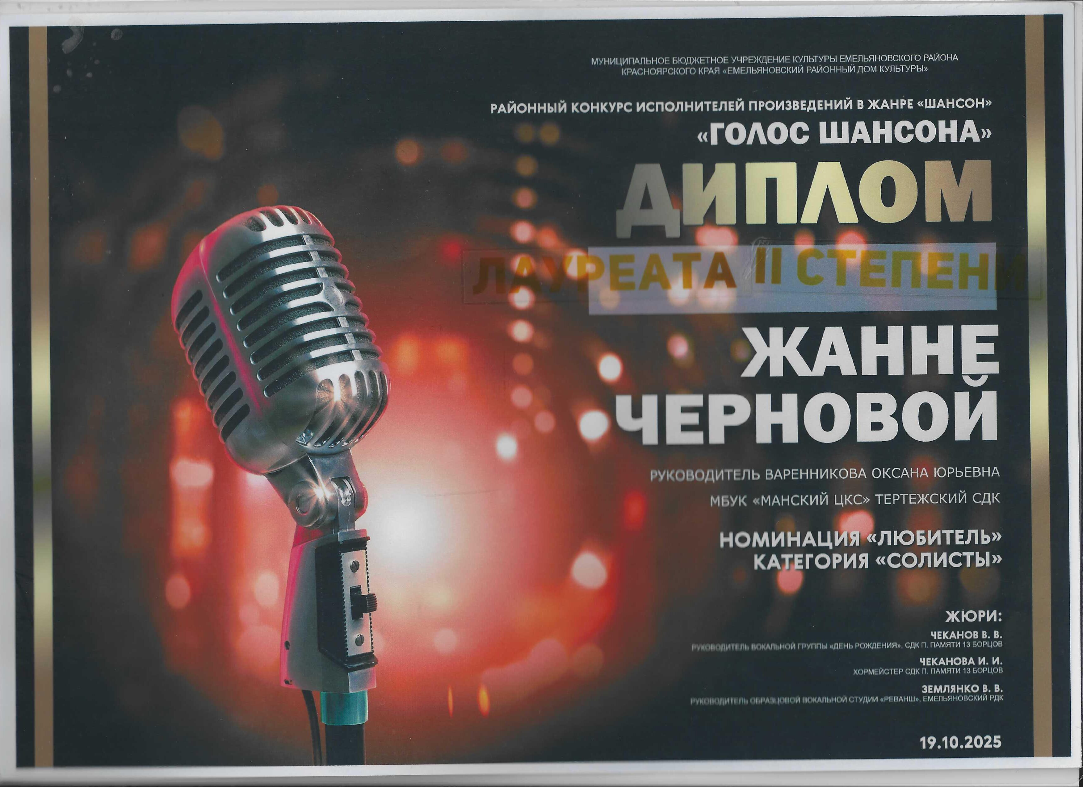 Голос сердца покорил сцену: Матвей Степанов — обладатель 15 ноября коллектив Тертежского сельского Дома культуры принял участие в творческом состязании районного конкурса детского вокального творчества «Манская жемчужина», который прошел на сцене Первоманского сельского Дома культуры. Концертный зал оживал от восторга зрителей, собравшихся поддержать юных исполнителей, стремящихся раскрыть таланты в рамках ежегодного детского вокального творчества. Детство …