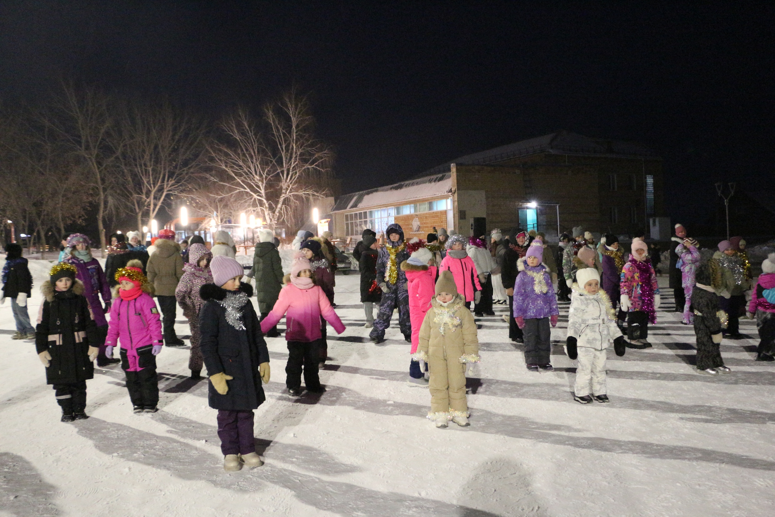 Празднично украшенная площадь сияла огнями, а вокруг пушистой ёлки собрались дети и взрослые. Программа началась с массового флешмоба в исполнении студии танца «Своя Атмосфера».